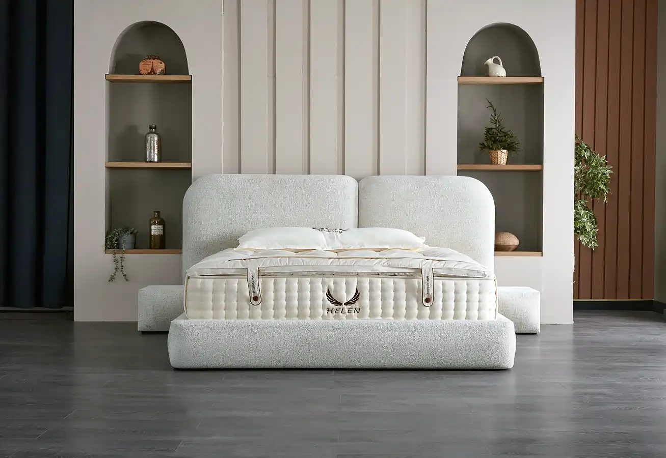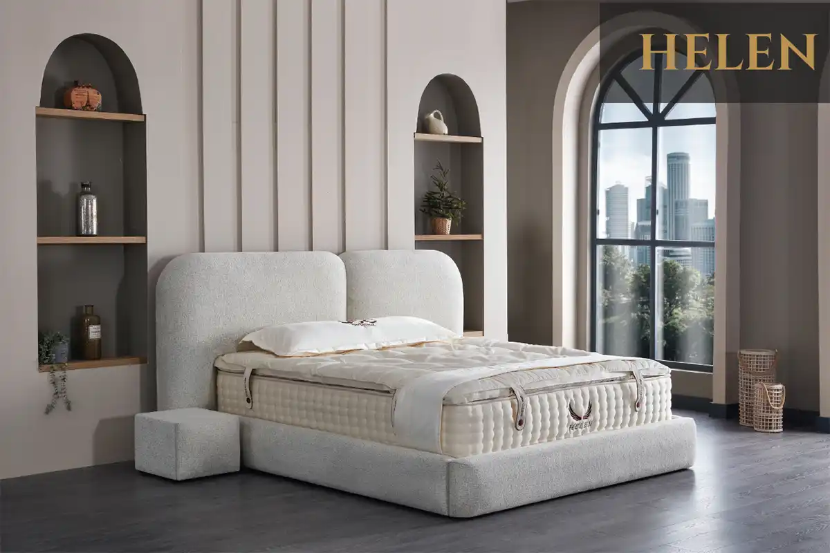 Model HELEN vnesie do vašej spálne pocit rovnováhy a čistého štýlu. Dominantou je jemne zaoblené čelo rozdelené na dve časti, ktoré v kombinácii so svetlou štruktúrovanou látkou pôsobí moderne a prívetivo. Vďaka nízkym bočniciam si posteľ zachováva kompaktný tvar, zatiaľ čo jej minimalistický dizajn vyzdvihuje precízne spracovanie bez zbytočnej hlučnosti.